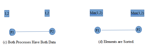 - i) Let Process P1 contains element having value ‘1’ and Process P2 contains element having value as ‘2’. Let process P1 comes before P2. To arrange two elements in ascending order, first thing to do is send the element from one process to another and compare them in the process.