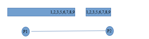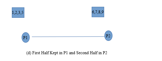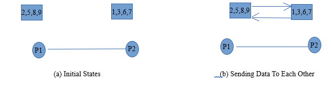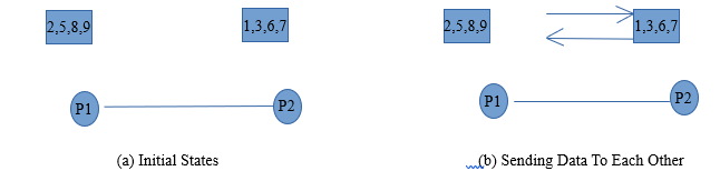 - ii) In this case also, consider the example of two processes P1 and P2. Let us consider that P1 contains elements (2,5,8,9) and P2 contains (1,3,6,7).