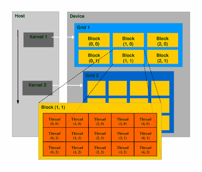 A thread block is a programming abstraction that represents a group of threads that can be executing serially or in parallel. For better process and data mapping, threads are grouped into thread blocks. The number of threads varies with available shared memory. The number of threads in a thread block is also limited by the architecture to a total of 512 threads per block. The threads in the same thread block run on the same stream processor. Threads in the same block can communicate with each other via shared memory, barrier synchronization or other synchronization primitives such as atomic operations.Multiple blocks are combined to form a grid. All the blocks in the same grid contain the same number of threads. Since the number of threads in a block is limited to 512, grids can be used for computations that require a large number of thread blocks to operate in parallel.CUDA is a parallel computing platform and programming model that higher level languages can use to exploit parallelism. In CUDA, the kernel is executed with the aid of threads. The thread is an abstract entity that represents the execution of the kernel. A kernel is a small program or a function. Multi threaded applications use many such threads that are running at the same time, to organize parallel computation. Every thread has an index, which is used for calculating memory address locations and also for taking control decisions.