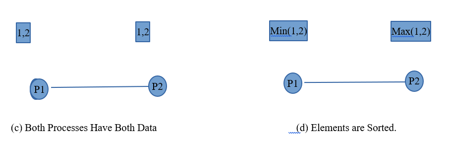 - i) Let Process P1 contains element having value ‘1’ and Process P2 contains element having value as ‘2’. Let process P1 comes before P2. To arrange two elements in ascending order, first thing to do is send the element from one process to another and compare them in the process.