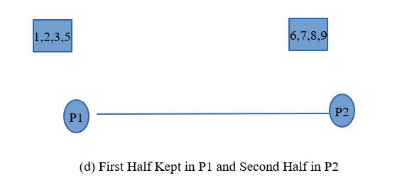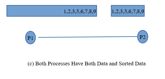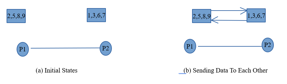 - ii) In this case also, consider the example of two processes P1 and P2. Let us consider that P1 contains elements (2,5,8,9) and P2 contains (1,3,6,7).