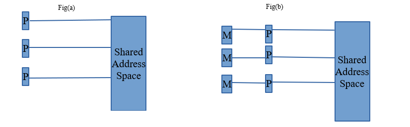 - ii) In contrast, a shared memory multiprocessor offers a single memory space used by all processors. Processors do not have to be aware where data resides, except that there may be performance penalties, and that race conditions are to be avoided.In a distributed memory system there is typically a processor, a memory, and some form of interconnection that allows programs on each processor to interact with each other.