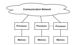 - Here processors have their own memory. Programs modules are designed in such a way that they can run in each processor.