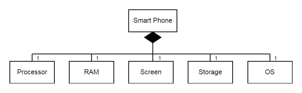 - Figure shows the composition relationship and uses smartphone as composite class and its part to depict entire relationship.
