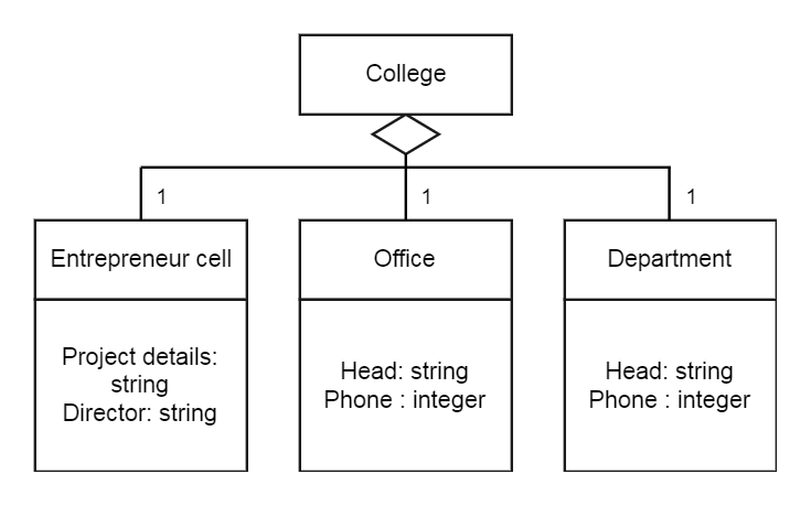 - Let take an example of a college class which composed of classes like department, office. So we can say that department is a part of college.