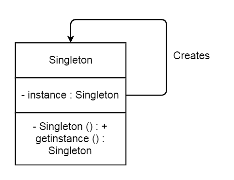 - In singleton pattern, only one instance of class must be created and which can be used as global point of access. In this, class is responsible for instantiating itself.